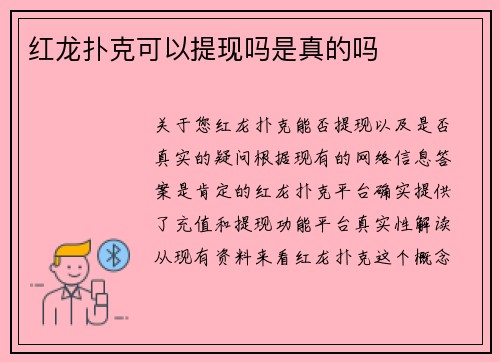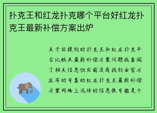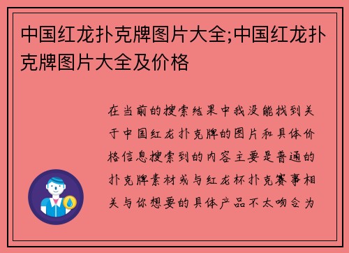 关于“红龙扑克是否正规”这个问题,我查阅了多个网络信息来源。需要需要明确的是,这些信息的权威性有限,无法像政府或权威金融机构的认证那样,为您提供一个绝对确切的官方定论。 我可以基于现有的搜索结果,为您...